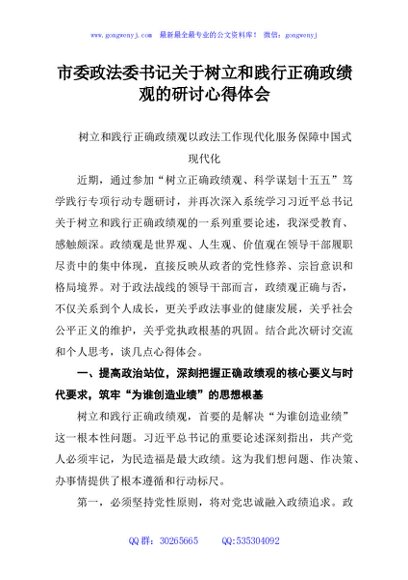 / 市委政法委书记关于树立和践行正确政绩观的研讨心得体会