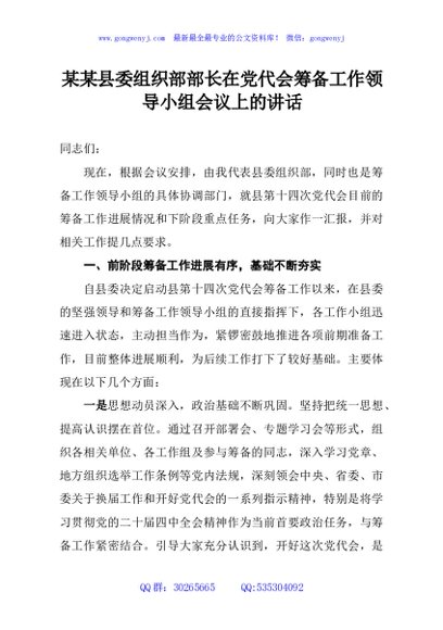 / 某某县委组织部部长在党代会筹备工作领导小组会议上的讲话