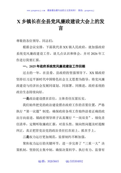 / X乡镇长在全县党风廉政建设大会上的发言