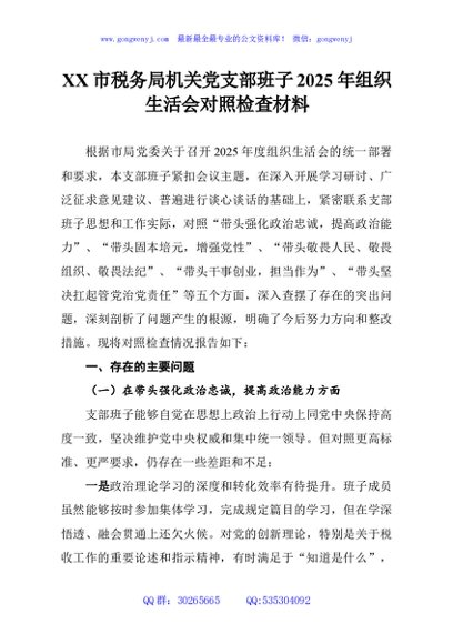 / XX市税务局机关党支部班子2025年组织生活会对照检查材料