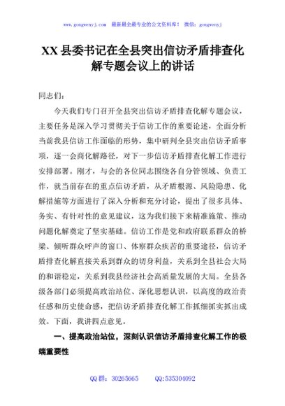 / XX县委书记在全县突出信访矛盾排查化解专题会议上的讲话