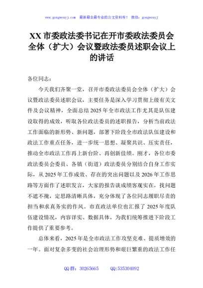 / XX市委政法委书记在开市委政法委员会全体(扩大)会议暨政法委员述职会议上的讲话