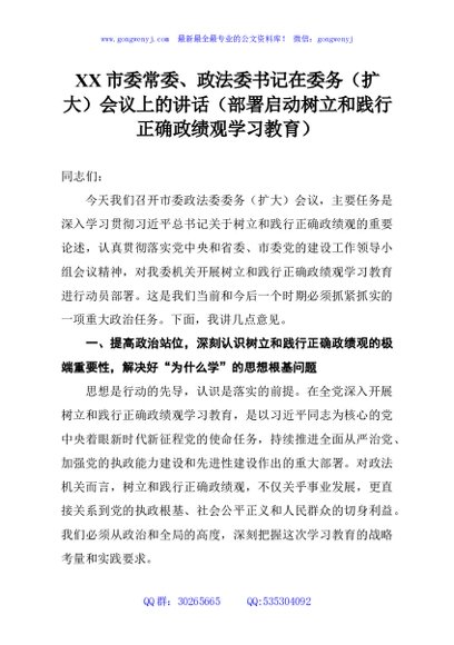 / XX市委常委、政法委书记在委务(扩大)会议上的讲话(部署启动树立和践行正确政绩观学习教育)