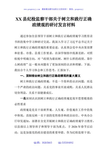 / XX县纪检监察干部关于树立和践行正确政绩观的研讨发言材料