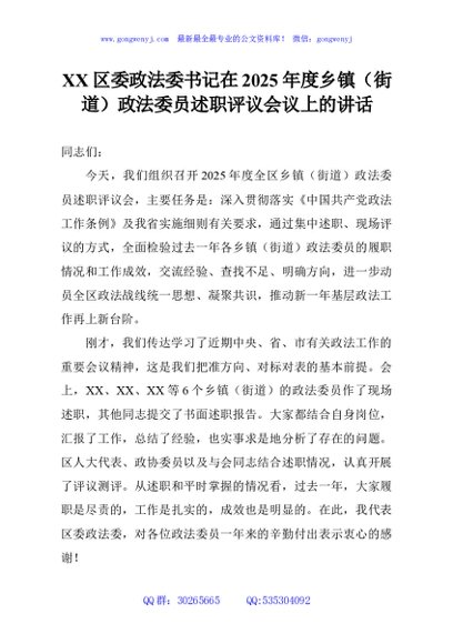 / XX区委政法委书记在2025年度乡镇(街道)政法委员述职评议会议上的讲话