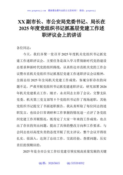/ XX副市长、市公安局党委书记、局长在2025年度党组织书记抓基层党建工作述职评议会上的讲话