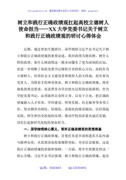 / 树立和践行正确政绩观扛起高校立德树人使命担当——XX大学党委书记关于树立和践行正确政绩观的研讨心得体会