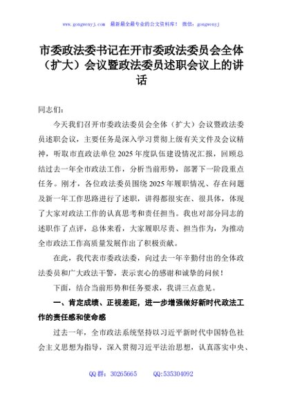 / 市委政法委书记在开市委政法委员会全体(扩大)会议暨政法委员述职会议上的讲话
