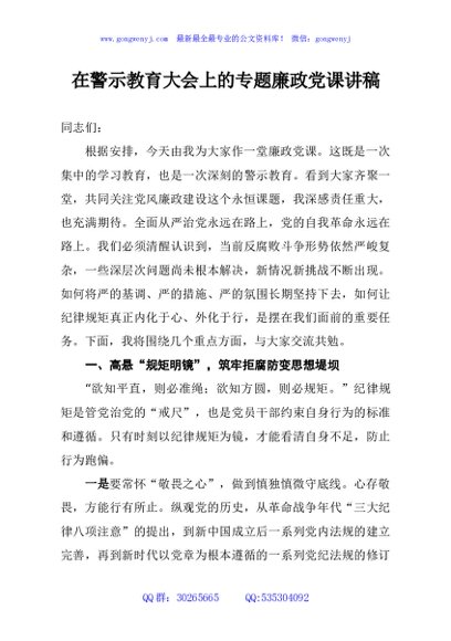 / 在警示教育大会上的专题廉政党课讲稿