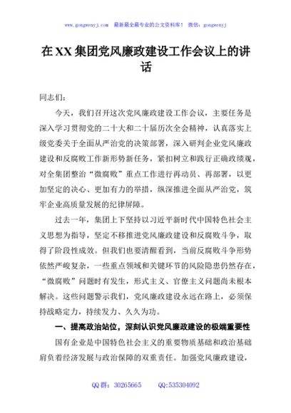 / 在XX集团党风廉政建设工作会议上的讲话