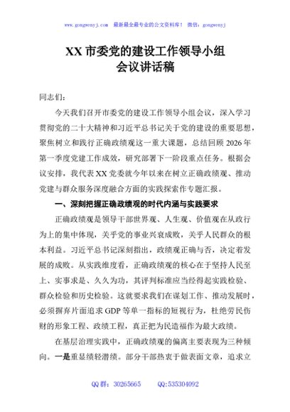 / XX市委党的建设工作领导小组会议讲话稿