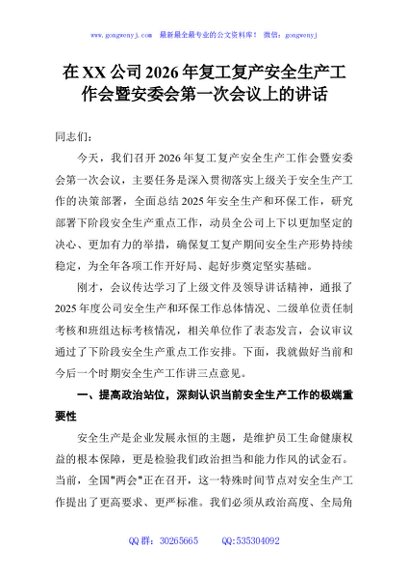 / 在XX公司2026年复工复产安全生产工作会暨安委会第一次会议上的讲话