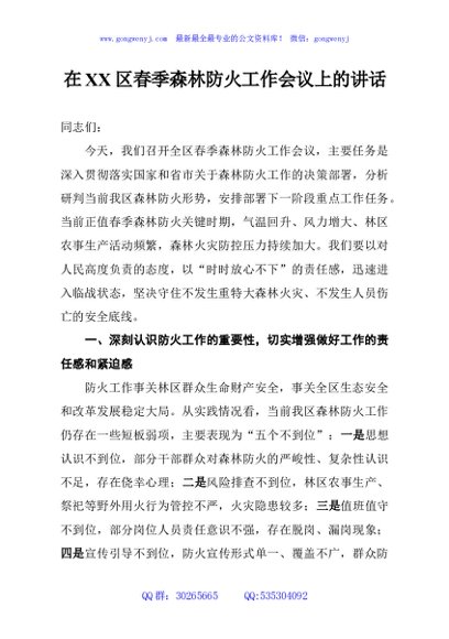 / 在XX区春季森林防火工作会议上的讲话