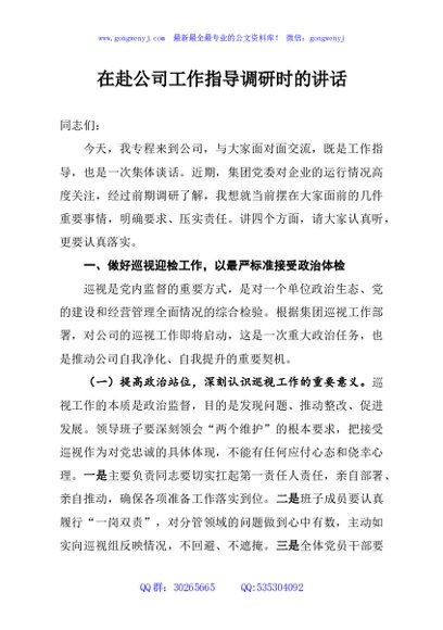 / 在赴公司工作指导调研时的讲话