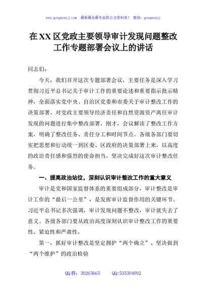/ 在XX区党政主要领导审计发现问题整改工作专题部署会议上的讲话