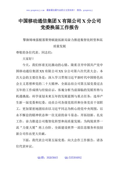 / 中国移动通信集团X有限公司X分公司党委换届工作报告