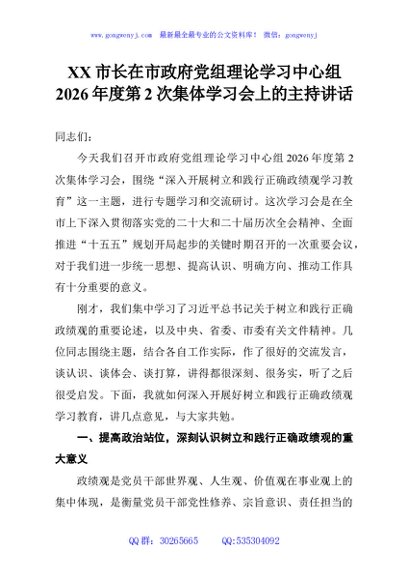 / XX市长在市政府党组理论学习中心组2026年度第2次集体学习会上的主持讲话