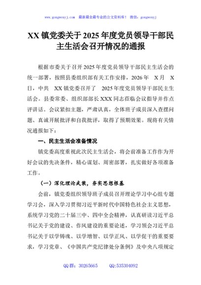 / XX镇党委关于2025年度党员领导干部民主生活会召开情况的通报