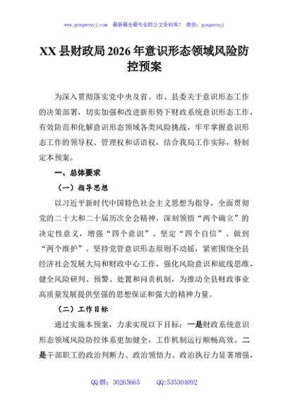 / XX县财政局2026年意识形态领域风险防控预案