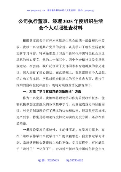 / 公司执行董事、经理2025年度组织生活会个人对照检查材料