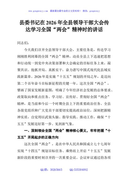 / 县委书记在2026年全县领导干部大会传达学习全国“两会”精神时的讲话
