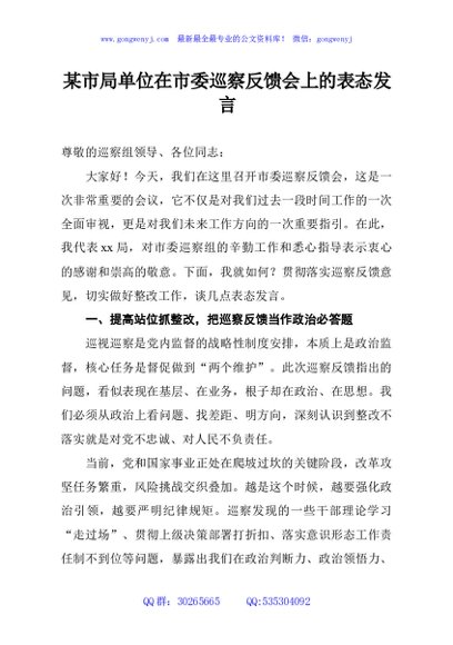 / 某市局单位在市委巡察反馈会上的表态发言