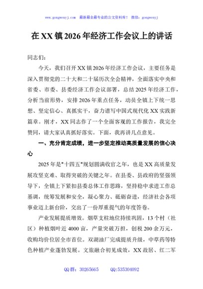 / 在XX镇2026年经济工作会议上的讲话