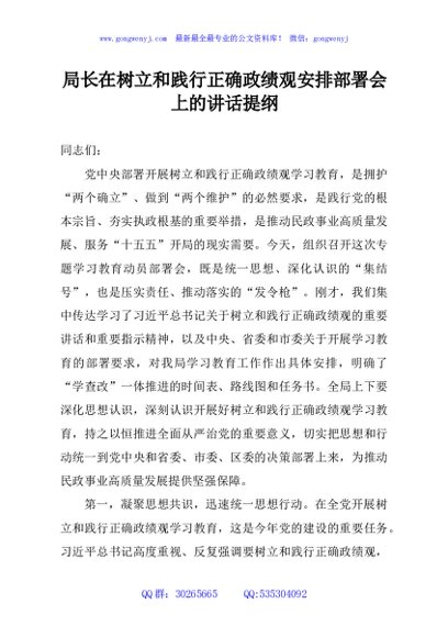 / 局长在树立和践行正确政绩观安排部署会上的讲话提纲