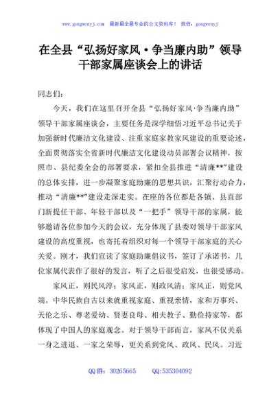 / 在全县“弘扬好家风·争当廉内助”领导干部家属座谈会上的讲话
