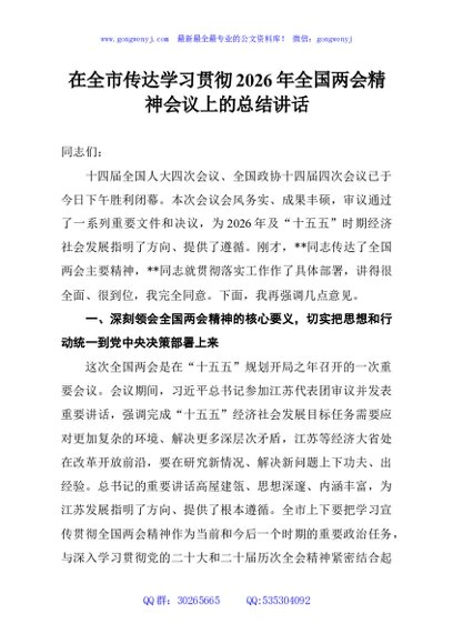 / 在全市传达学习贯彻2026年全国两会精神会议上的总结讲话