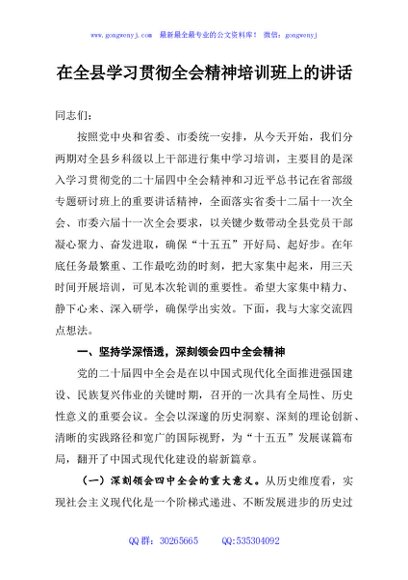 / 在全县学习贯彻全会精神培训班上的讲话