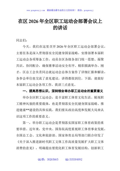 / 在区2026年全区职工运动会部署会议上的讲话