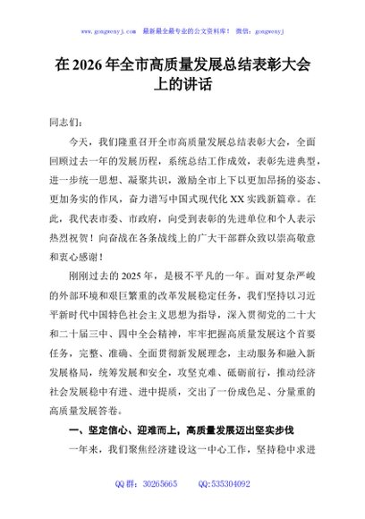 / 在2026年全市高质量发展总结表彰大会上的讲话