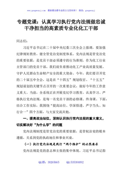 / 专题党课:认真学习执行党内法规做忠诚干净担当的高素质专业化化工干部