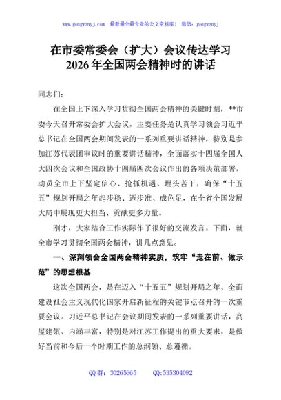 / 在市委常委会(扩大)会议传达学习2026年全国两会精神时的讲话