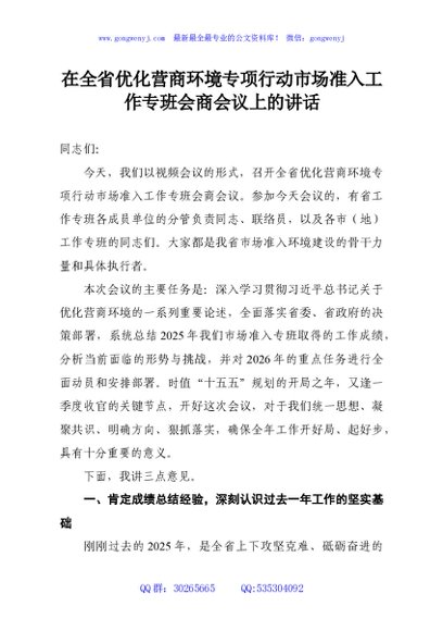 / 在全省优化营商环境专项行动市场准入工作专班会商会议上的讲话