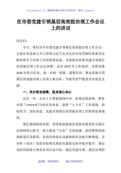 / 在市委党建引领基层高效能治理工作会议上的讲话