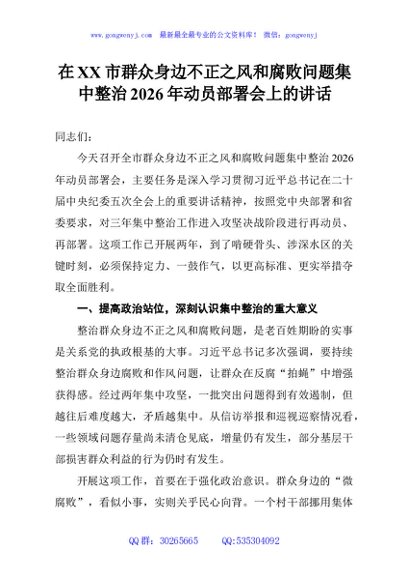 / 在XX市群众身边不正之风和腐败问题集中整治2026年动员部署会上的讲话