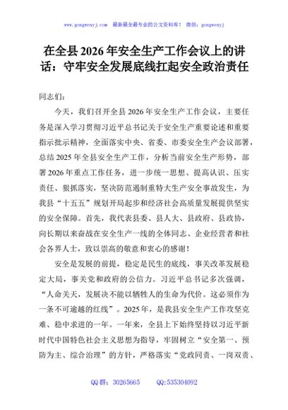/ 在全县2026年安全生产工作会议上的讲话:守牢安全发展底线扛起安全政治责任