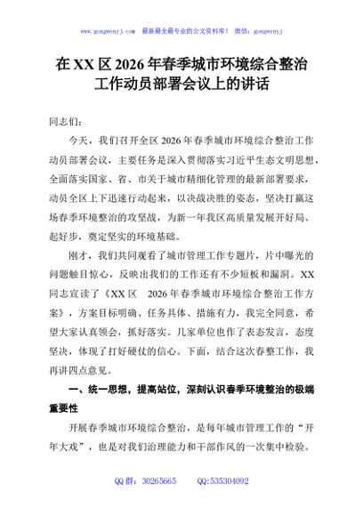 / 在XX区2026年春季城市环境综合整治工作动员部署会议上的讲话