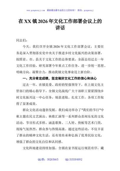 / 在XX镇2026年文化工作部署会议上的讲话