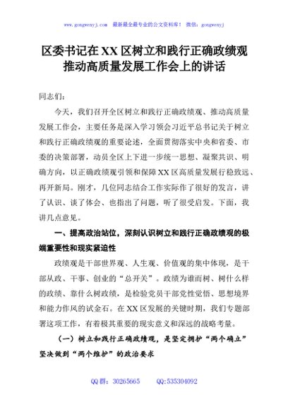 / 区委书记在XX区树立和践行正确政绩观推动高质量发展工作会上的讲话