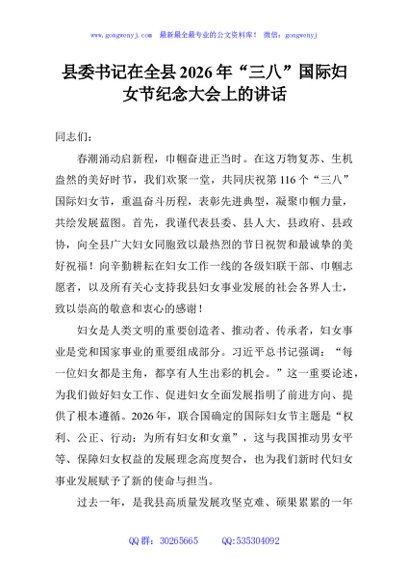 / 县委书记在全县2026年“三八”国际妇女节纪念大会上的讲话