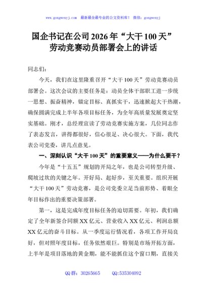 / 国企书记在公司2026年“大干100天”劳动竞赛动员部署会上的讲话