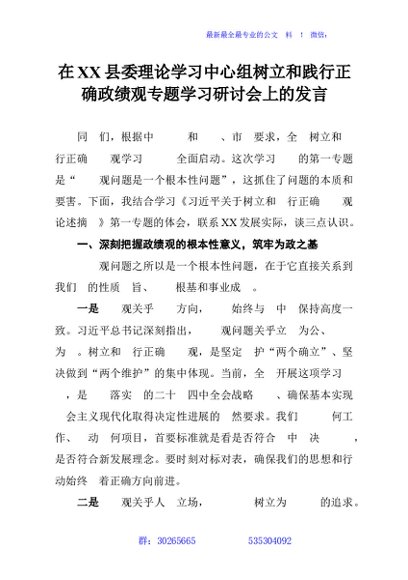 / 在XX县委理论学习中心组树立和践行正确政绩观专题学习研讨会上的发言