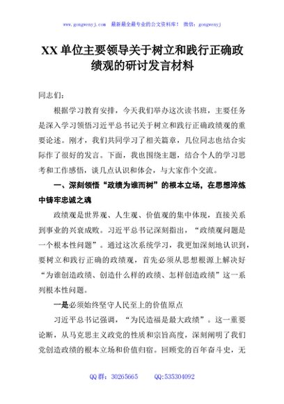 / XX单位主要领导关于树立和践行正确政绩观的研讨发言材料