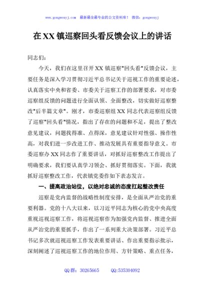 / 在XX镇巡察回头看反馈会议上的讲话