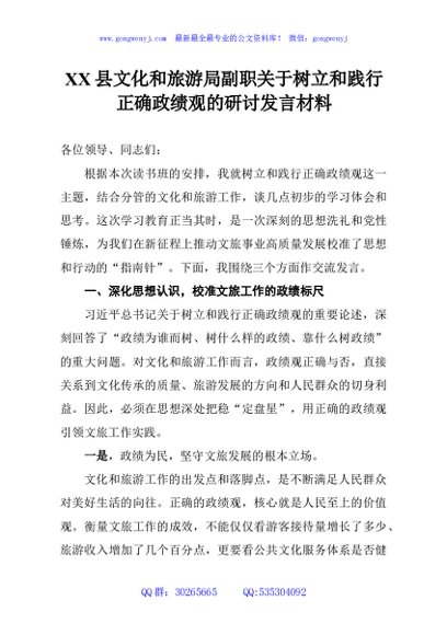/ XX县文化和旅游局副职关于树立和践行正确政绩观的研讨发言材料