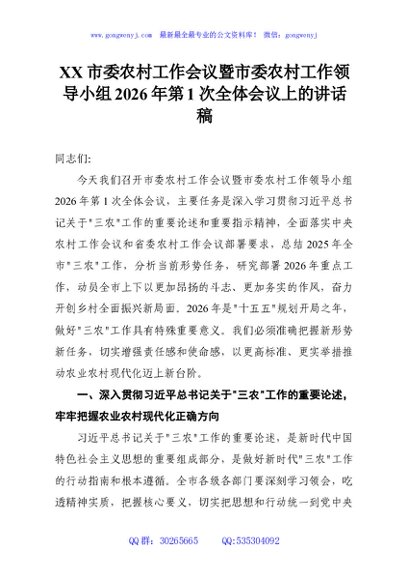 / XX市委农村工作会议暨市委农村工作领导小组2026年第1次全体会议上的讲话稿