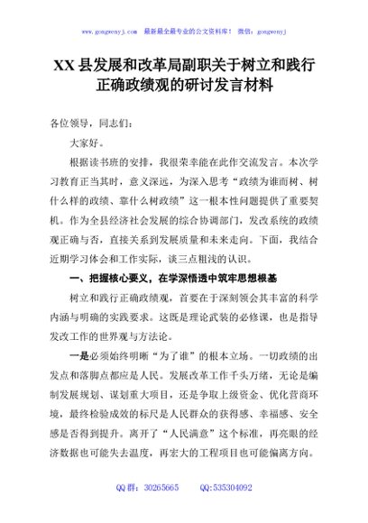 未生成预览图,长按二维码添加 XX县发展和改革局副职关于树立和践行正确政绩观的研讨发言材料 - 公文研究